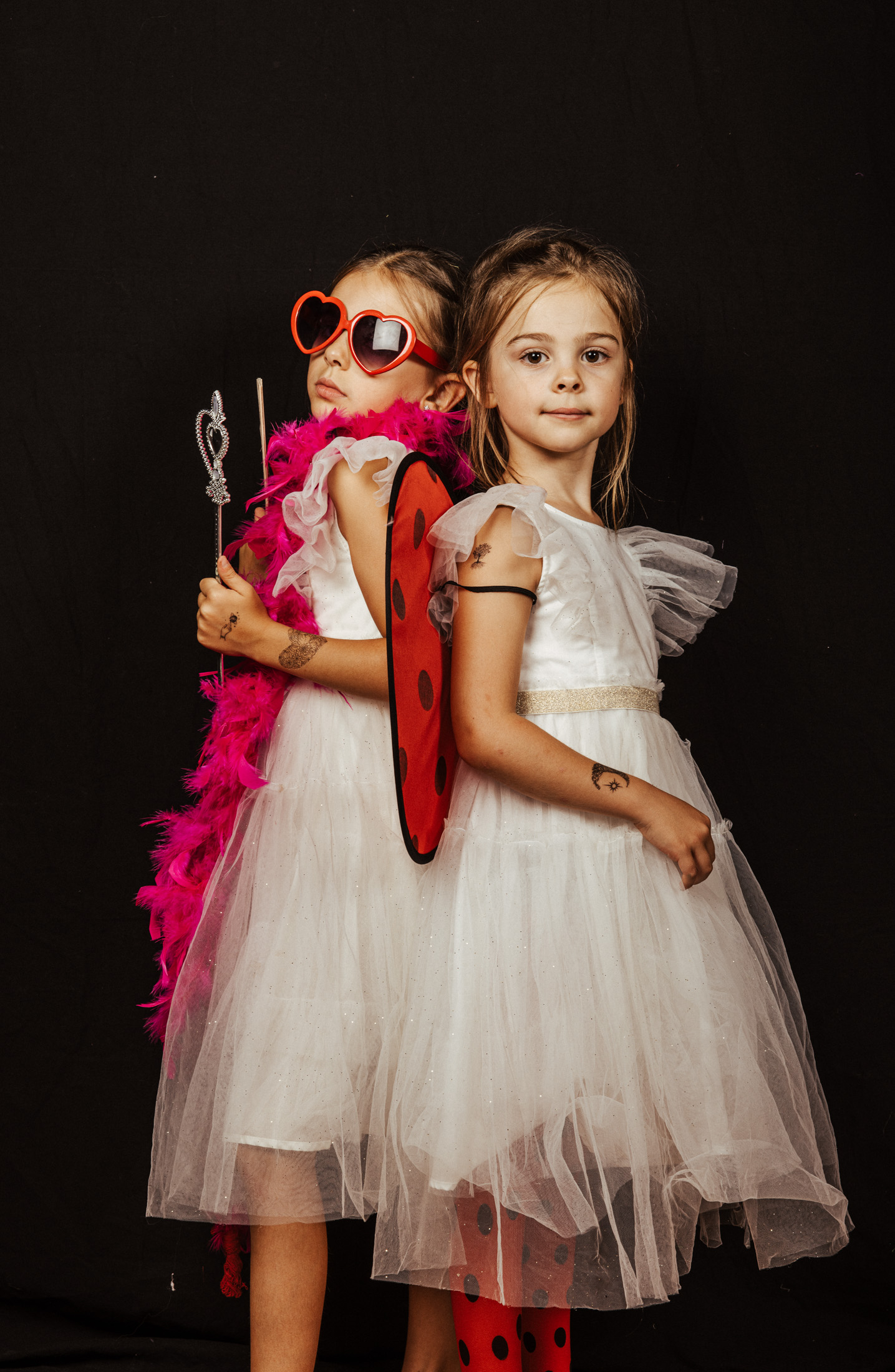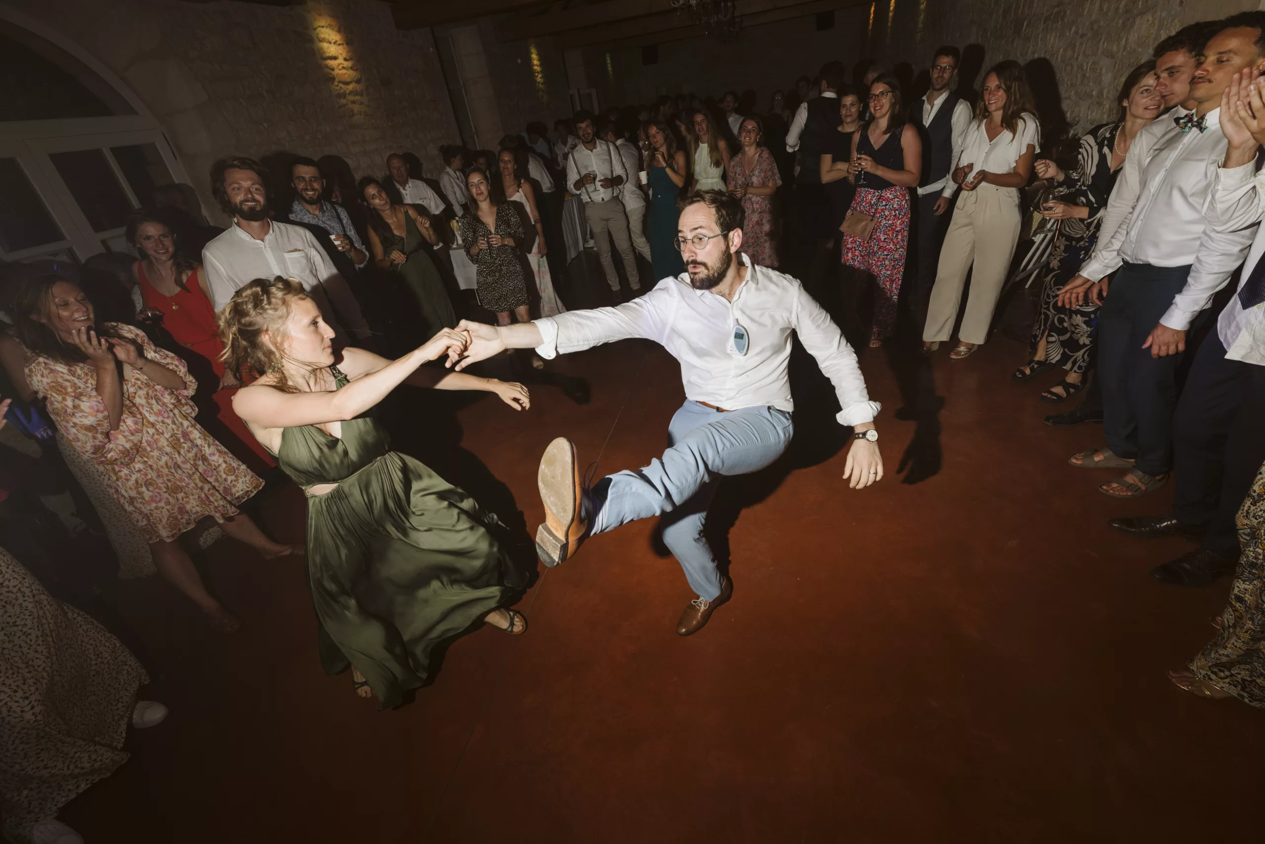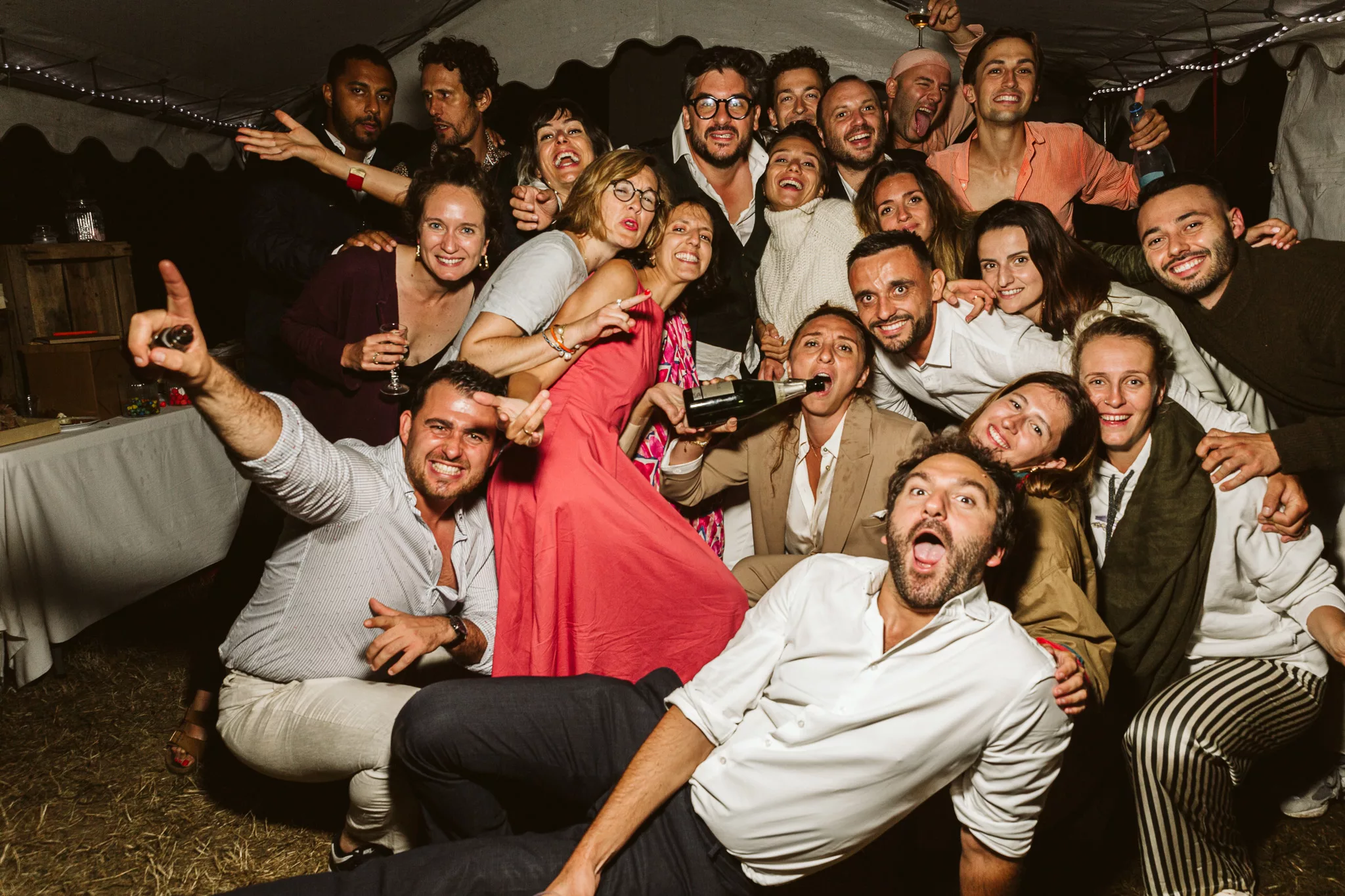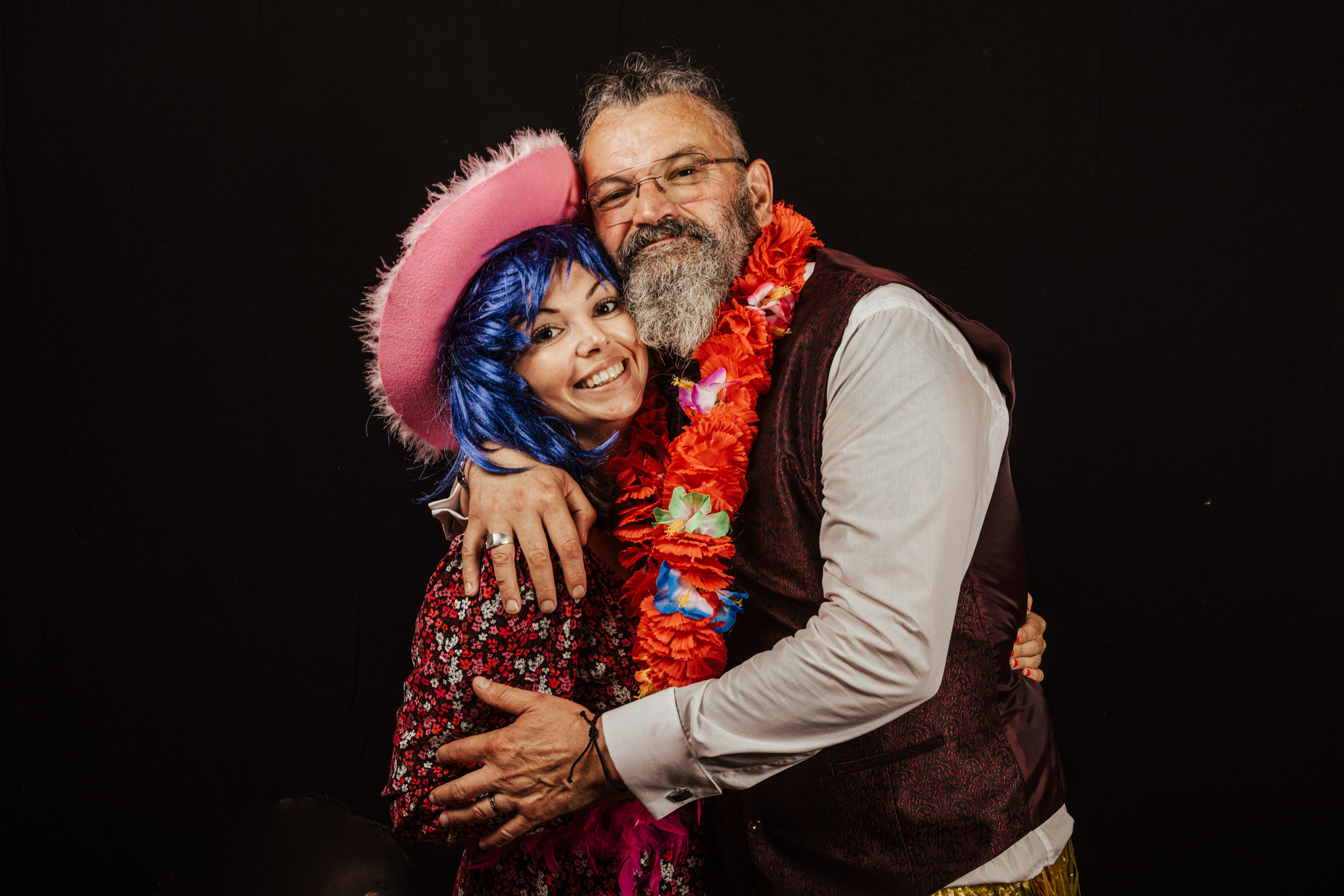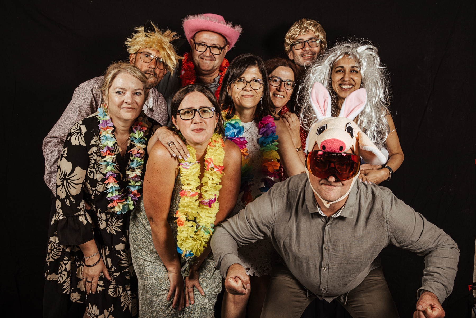 Le soir, je propose une prestation peu courante dans la photographie de mariage: le studio photo. Constitué d’un fond et de deux torches (Elinchrom D-Lite RX4) munies de boîtes de lumière, ce dispositif a le double avantage de produire des photos classes et élégantes d’inspiration Harcourt et des photos de soirée plus décalées avec un maximum de personnes. Avec cette formule, j’assure non seulement à mes clients des photos de soirée de qualité (ce qui est rarement le cas dans un contexte de basse lumière) mais aussi une animation qui fait fureur et lance le dancefloor. Surtout si vos invités cèdent aux sirènes du déguisement.
