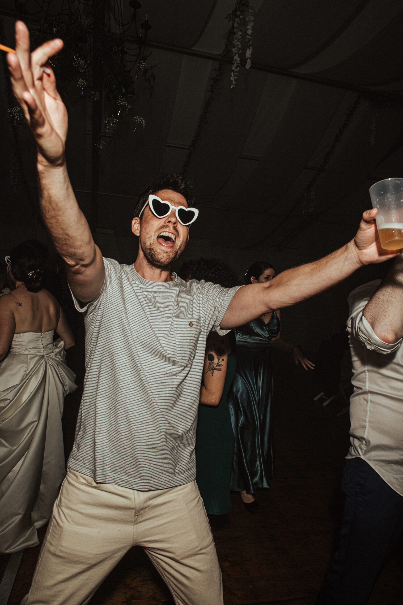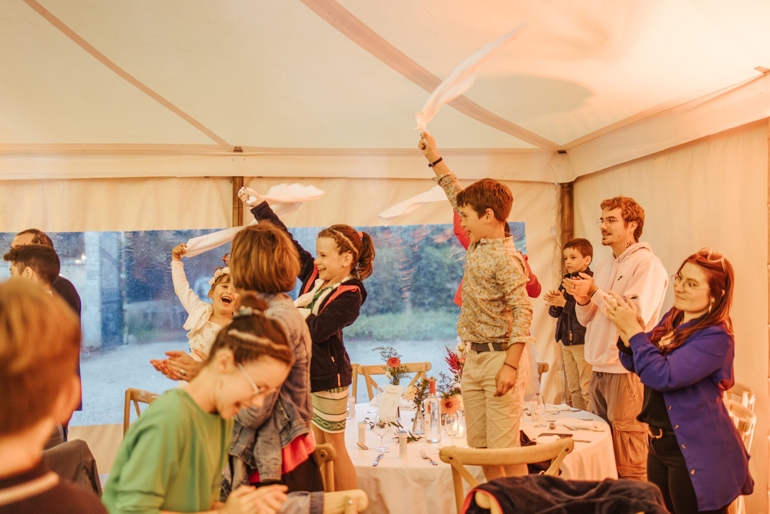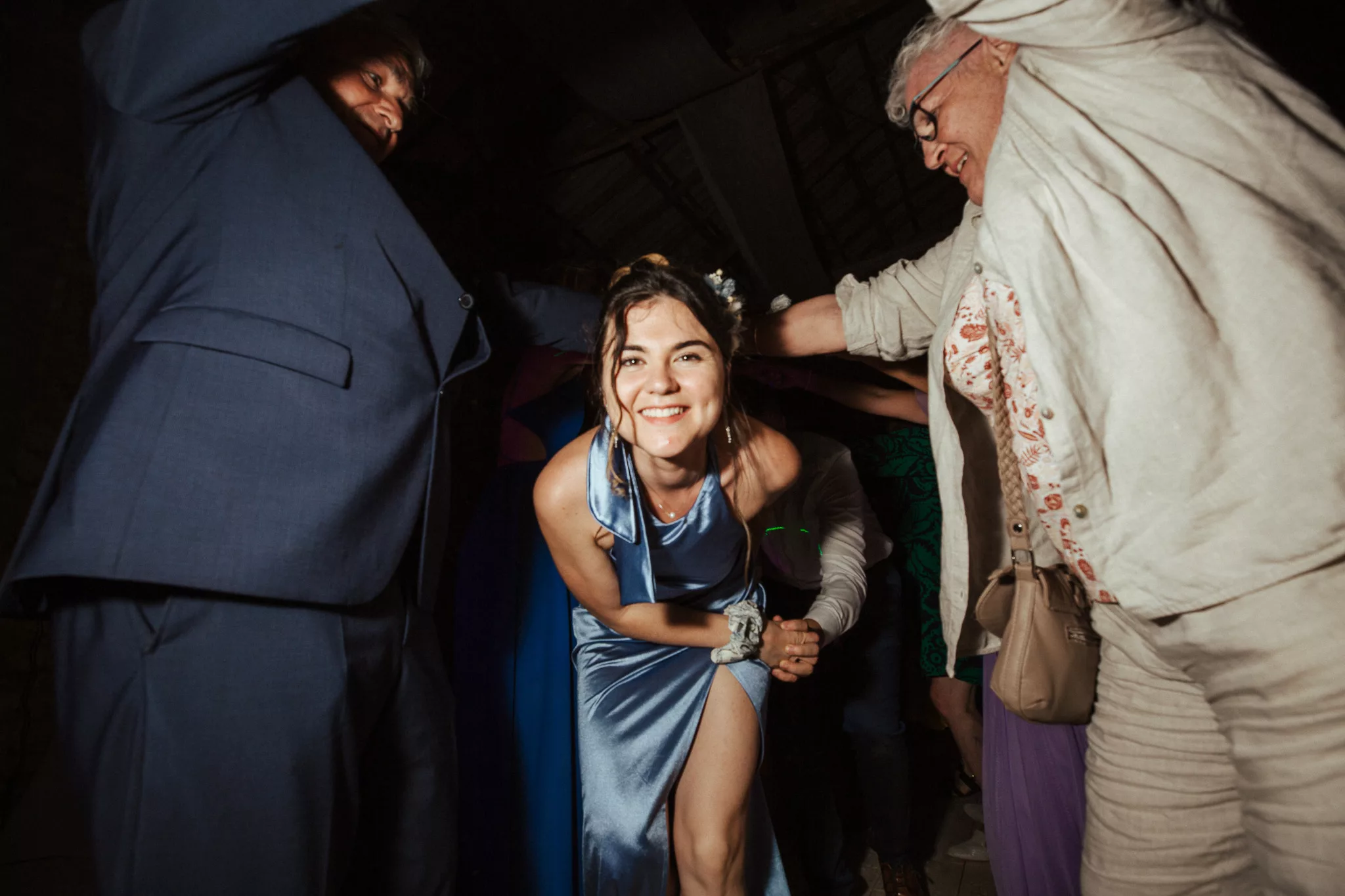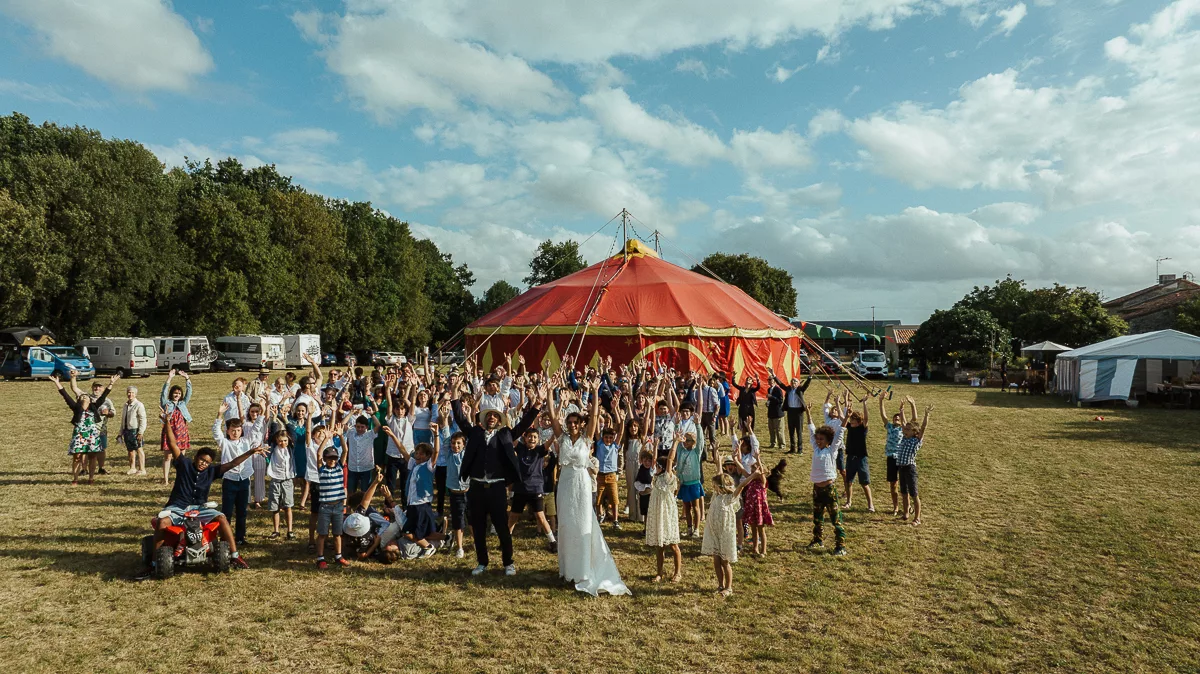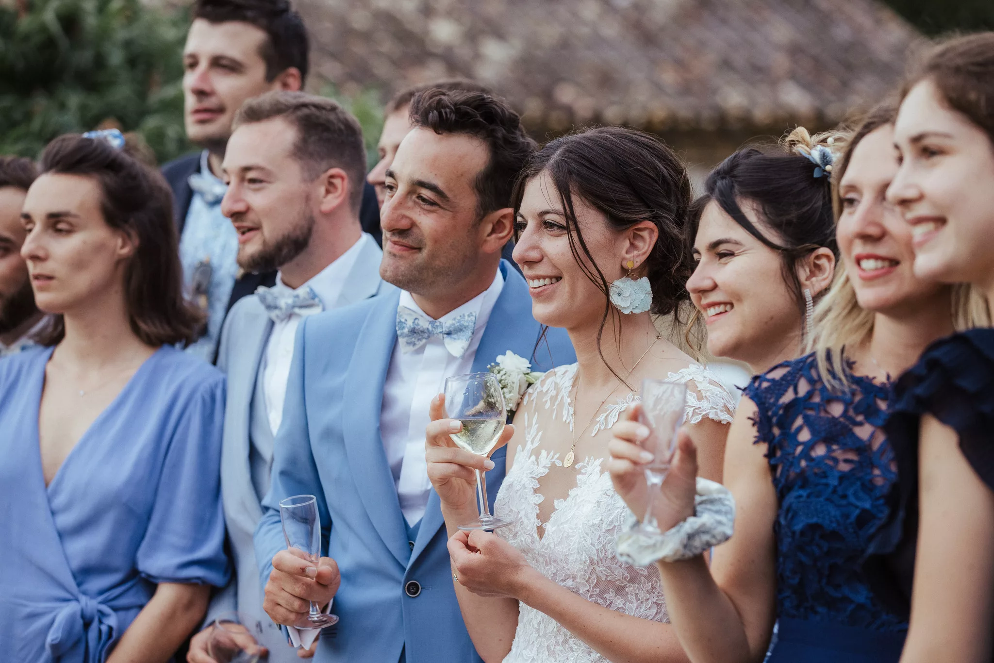 Le soir, je propose une prestation peu courante dans la photographie de mariage: le studio photo. Constitué d’un fond et de deux torches (Elinchrom D-Lite RX4) munies de boîtes de lumière, ce dispositif a le double avantage de produire des photos classes et élégantes d’inspiration Harcourt et des photos de soirée plus décalées avec un maximum de personnes. Avec cette formule, j’assure non seulement à mes clients des photos de soirée de qualité (ce qui est rarement le cas dans un contexte de basse lumière) mais aussi une animation qui fait fureur et lance le dancefloor. Surtout si vos invités cèdent aux sirènes du déguisement.